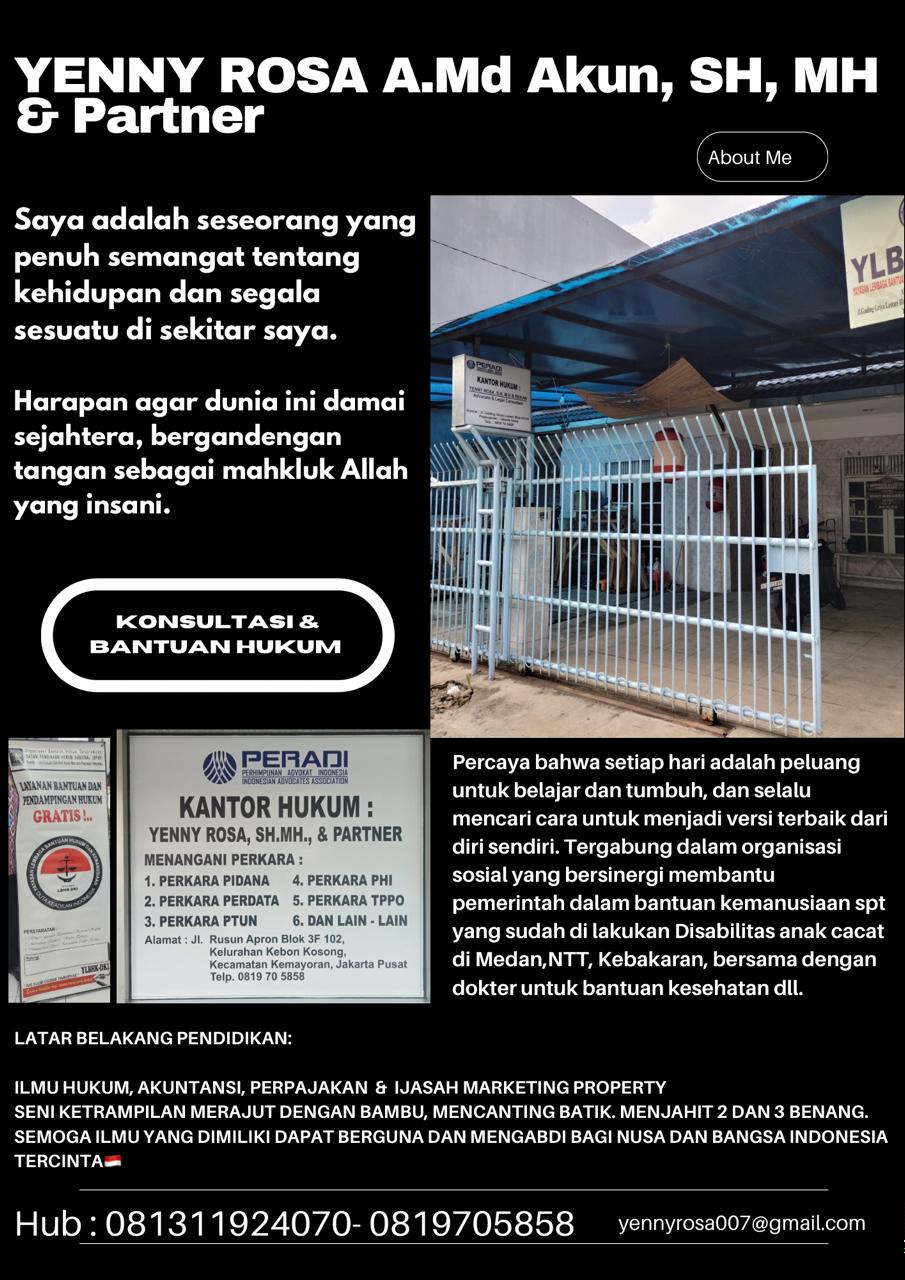 Fiat Justitia Ruat Caelum “Hendaklah Keadilan Ditegakkan Walaupun Langit Akan Runtuh”. Bantuan Hukum kepada mereka yang membutuhkan. contact: Yenny Rosa, A.Md, SH,MH Telp + Wa 0813 1192 4070